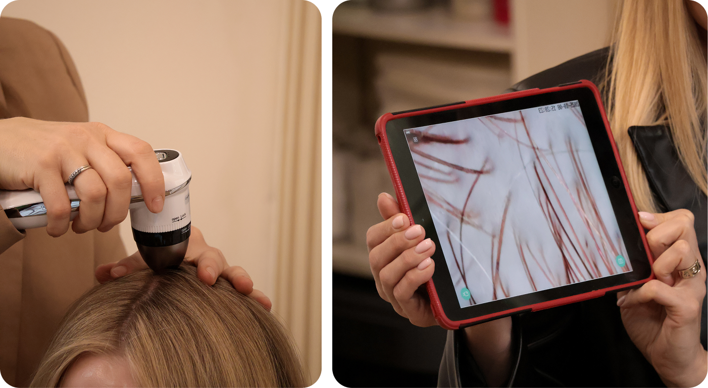 We examine: scalp condition, follicles, density, microcirculation, inflammation or blockage, hair shaft quality